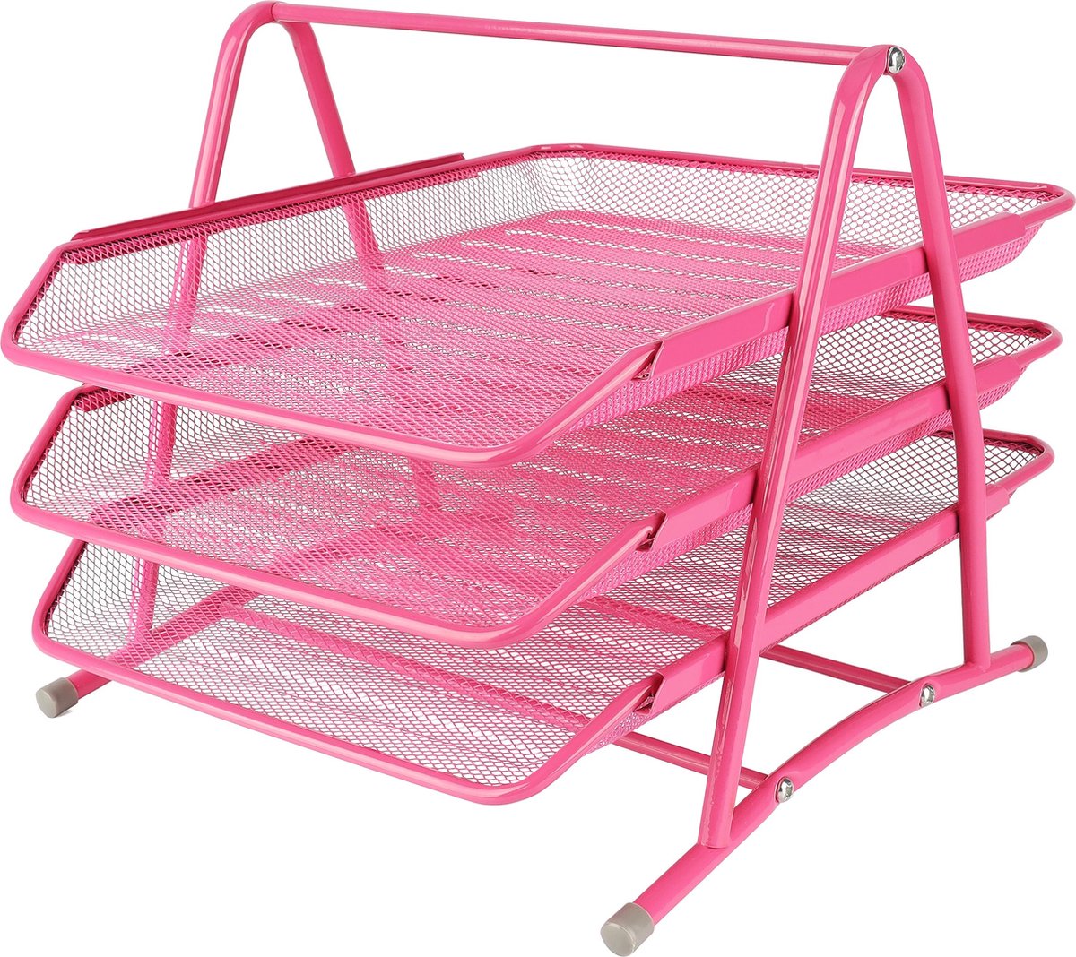 3 LAAGS BUREAU ORGANIZER: Deze 3 laags roze gaas bureau organizer heeft een simpel en elegant ontwerp. Het volledige opslag rek meet B30 x D35 x H26,5 cm en heeft 3 gladde uit-schuif trays; De rubberen basis is non-slip en zal niet uw ondergrond bekrassen