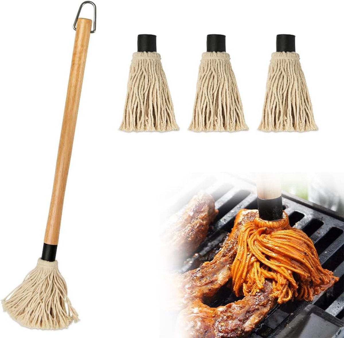 Grillkwast, BBQ-borstel, basting mop, professionele saus, saus, marinades, grillborstel, barbecue met houten handvat en 3 stuks extra reservekoppen voor het koken, braden en grillen