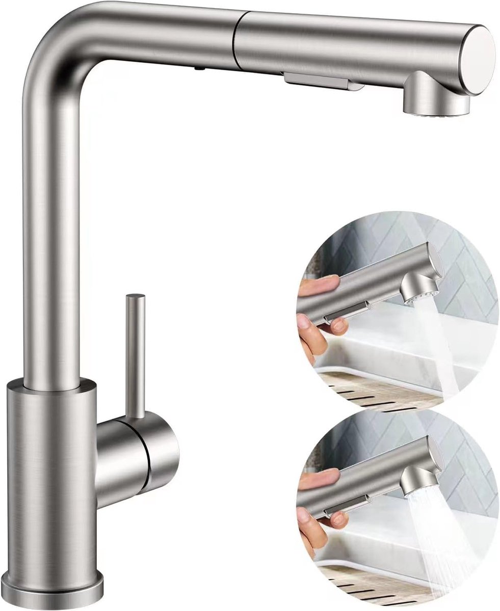 Hogedrukkraan keuken, keukenkraan met sproeikop, uittrekbaar, wastafelarmatuur met flexibele douchekop, eenhendel mengkraan met twee sproeisoorten, armatuur keuken 360° draaibaar, roestvrij staal