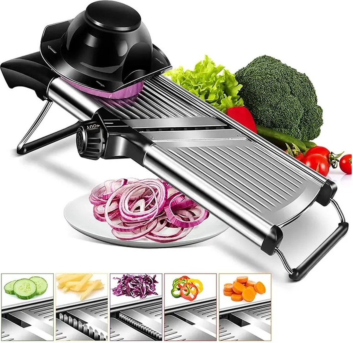 Verstelbare Snijdikte: Pas eenvoudig de snijdikte aan met de verstelbare knop, zodat je de perfecte snede kunt bereiken, of het nu voor een frisse salade of een stevige ovenschotel is.