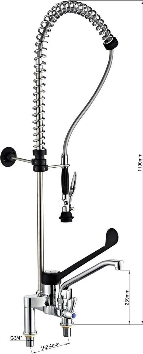Tweegats voorspoelspoeler met mengkraan 4000 | Aanwijzingen | Kan niet gebruikt worden met een lagedrukverwarmer | Uitvoering: | Serviesspoeler met twee openingen | Zwenkkraan & eenknopsmengkraan | Voor wandmontage | Sproeier is draaibaar met 360° | Eenvoudige montage | Eenvoudig te reinigen | Kwaliteit | Vervaardigd van verchroomd metaal | Stabiele en flexibele veer | Veer en slang van RVS AISI 304 | Ergonomisch perfect gevormde kunststofgreep | Zeer robuust en duurzaam | Aansluiting | 3/4 | Schroefdraadaansluiting | Afmetingen | Buitenafmeting B x D x H: | 21 x 420 x 1190 mm | Leveringsomvang | Wandhouder | Waterkraan | Flexibele spoeler | Richtlijnen | Overeenkomstig de geldende hygiëne- en veiligheidsvoorschriften geproduceerd | Volgens CE-voorschriften | GGM Gastro