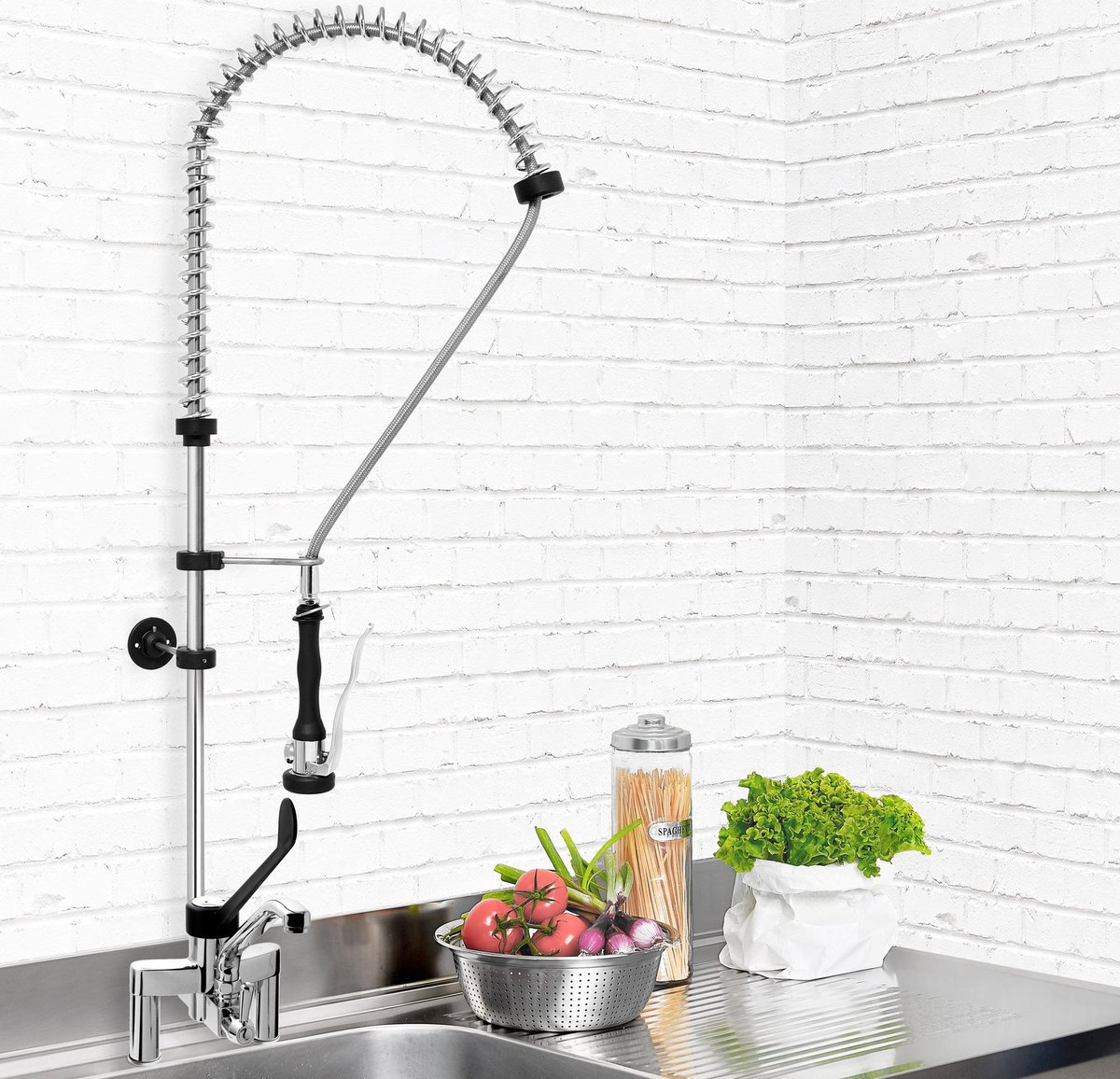 Tweegats voorspoelspoeler met mengkraan 4000 | Aanwijzingen | Kan niet gebruikt worden met een lagedrukverwarmer | Uitvoering: | Kwaliteitsproduct uit Europese productie | Premium-PLUS-uitvoering | Serviesspoeler met twee openingen | betere grip en hoogwaardigere materialen in vergelijking met de normale Premium-serie | Italiaans design | Zwenkkraan & eenknopsmengkraan | Schakelaar om de waterstroom automatisch te onderbreken | Voor wandmontage | Sproeier is draaibaar met 360° | Eenvoudige montage | Eenvoudig te reinigen | Kwaliteit | Vervaardigd van verchroomd metaal | Stabiele en flexibele veer | Ergonomisch perfect gevormde kunststofgreep | Voordelen van het product | Zeer robuust en duurzaam | lager waterverbruik dankzij de hoogwaardige beluchter | Het speciale ontwerp voorkomt dat er zich na gebruik waterdruppels vormen | verbeterde functies en gebruiksgemak | beter bestand tegen snelle temperatuurwisselingen en voedingsresten (zout, zuur) | bijzonder gelijkmatige waterstroom | eenvoudige bediening en simpel in het gebruik | Aansluiting | Wateraansluiting: | 1/2 inch | Aansluiting gootsteen: | 3/4 inch | Afmetingen | Buitenafmeting B x D x H: | 200 x 600 x 1170 mm | Leveringsomvang | Wandhouder | Waterkraan | Flexibele spoeler | Richtlijnen | Overeenkomstig de geldende hygiëne- en veiligheidsvoorschriften geproduceerd | Volgens CE-voorschriften | GGM Gastro